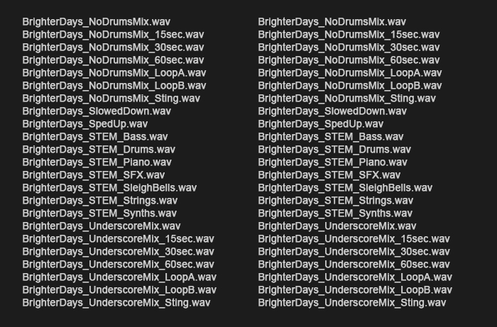• Alternate Versions β€” shorter edits, no-drums, underscore, loops, and 15 / 30 / 60-second cuts.