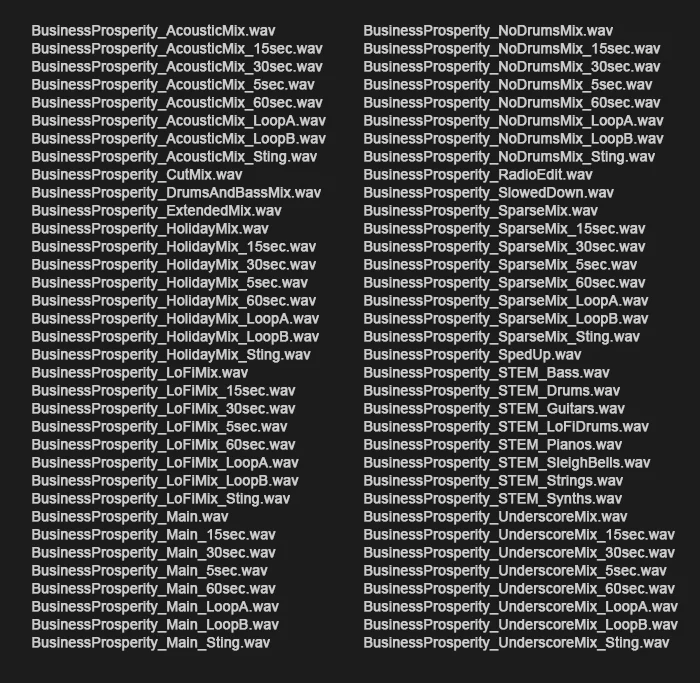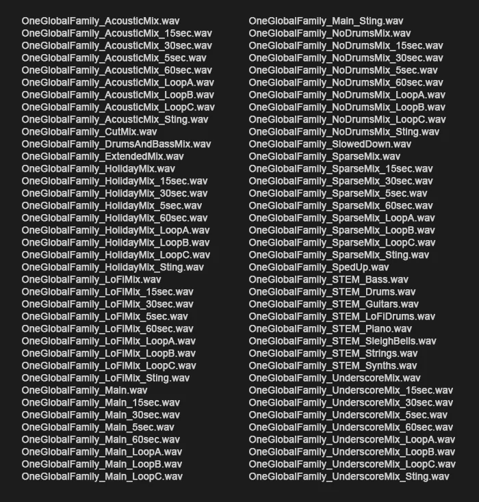 - Main Mix (Full + 30s / 60s edits, Loop A, Loop B, Sting)