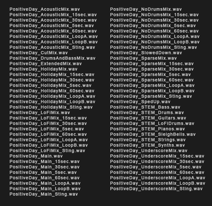 - Alternate Versions β shorter edits, no-drums, underscore, loops, and 15 / 30 / 60-second cuts.