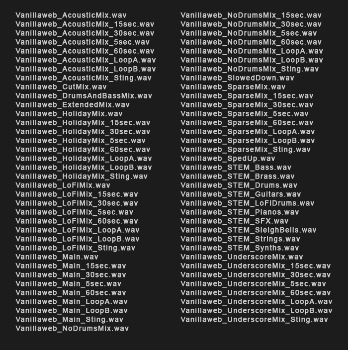 - Alternate Versions β shorter edits, no-drums, underscore, loops, and 15 / 30 / 60-second cuts.