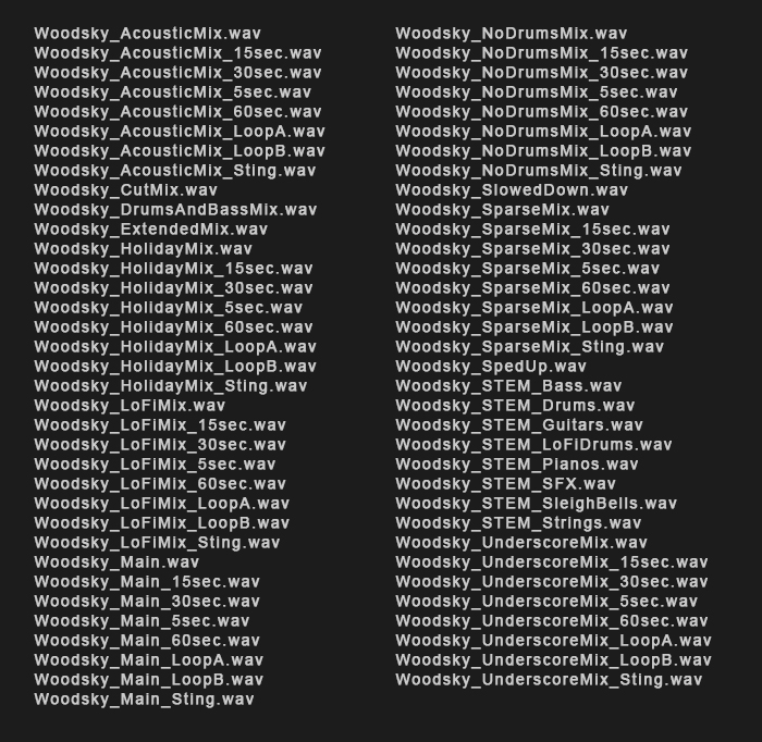 - Alternate Versions β shorter edits, no-drums, underscore, loops, and 15 / 30 / 60-second cuts.